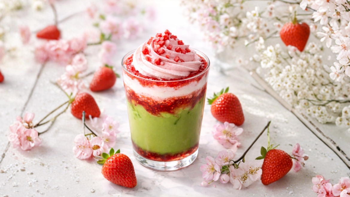 まろやかな抹茶ミルクに、甘酸っぱいいちごジャムが彩を添えます。ふんわり生クリームの上には、さっぱりとしたいちごホイップが春を感じます。見た目にも心にも春を運ぶ、この季節だけの限定ドリンクです。